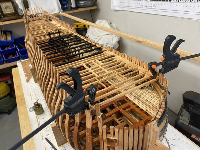 Voordat ik kon starten met het inrichten van het "Upper Deck" heb ik eerst een nieuwe voorraad hout aangelegd. Het hout op het "Upper Deck" is allemaal wat minder dik en ook de dekconstructie van het "Quarter Deck" is een stuk lichter en eenvoudiger. Dit betekent wel weer een andere werkwijze om de dekbalken in een ronding te krijgen. Ik heb daar speciale houtlijm voor gekocht en die kan goed tegen water en warmte. Dus die stoom ik zodra deze in elkaar zijn gezet om de juiste ronding te krijgen.